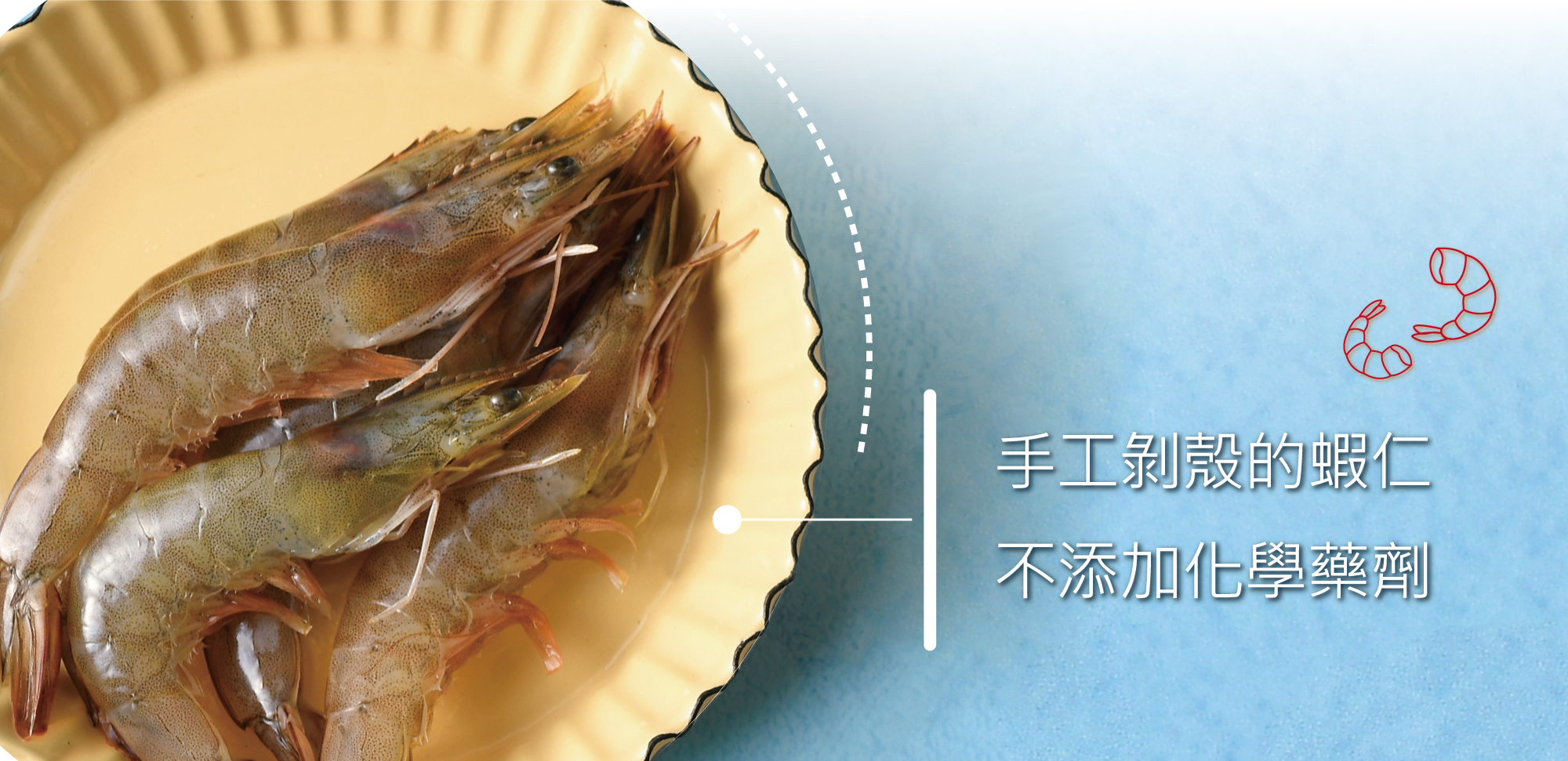 ● 生鮮白蝦手工剝殼的蝦仁,不添加化學藥劑